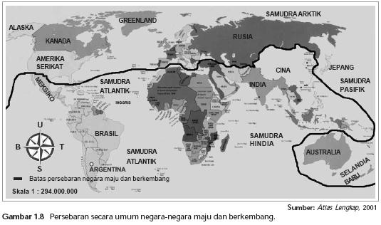 3.        Persebaran Negara Berkembang dan Negara Majua.        Negara Berkembang (Developing Country)Negara berkembangan berada di belahan bumi bagian selatan yang meliputi :1)        Benua Asia (sebagaian besar Negara berkembang) yang meliputi wilayah :-          Asia Tengah terdiri dari Kazahstan, Uzbekistan, Turkmenistan, Tajikistan, Kirghistan, dann Afganistan-          Asia Selatan terdiri dari Bangladesh, India, Pakistan, Nepal, Bhutan, Srilanka-          Asia Tenggara terdiri dari Indonesia, Myanmar, Filipina, Thailand, Kamboja, Vietnam, Laos, Malaysia, Timor Timur dan Brunei Darussalam-          Asia Barat terdiri dari Iran, Irak, Turki, Arab Saudi, Yaman, Oman, Libanon, Syiria2)        Benua Amerika yang meliputi wilayah :-          Amerika Tengah terdiri dari Meksiko, Guatemala, Honduras, Elsavador, Panama, Bellize, dan Costa Rica-          Kepulauan Karibia terdiri dari Kuba, Haiti, Republik Dominika, Jamaika-          Amerika Selatan terdiri dari Bolivia, Ekuador, Brasil, Kolombia, Venezuela, Argentina, Chile, Uruguay, Paraguay3)        Benua Afrika terdiri dari 55 negara diantaranya Kenya, Nigeria, Mesir, Sudan, Mali, Angola, Kongo, dsb.b.        Negara Maju (Develoved Country)Negara maju sebagian besar terdapat di belahan bumi bagian utara yang meliputi :1)        Eropa, misalnya Inggris, Perancis, Belanda, Jerman, Spanyol, Italia, Swedia, Norwegia, Swiss2)        Asia, misalnya Jepang, Korea Selatan, dan Singapura3)        Amerika, meliputi negara Kanada dan Amerika Serikat4)        Negara maju yang terletak di wilayah selatan terdiri dari Australia dan Selandia Baru4.        Perbedaan Negara maju dan berkembangNo.  Indikator Pembeda            Negara Maju                             Negara Berkembang1.          Pendapat perkapita                   Lebih dari US$5000                     Kurang dari US$50002.          Mata pencaharian                     Industri dan jasa                         Agraris dan pertanian3.          Tingkat SDM                            Kualitas tingg                             iKualitas rendah4.          Penggunaan energi                    Lebih dari 500 galon                    Kurang dari 500 galon5.          Usia harapan hidup                   Lebih dari 60 tahun                      Kurang dari 60 tahun6.          Kebutuhan kalori                       Sudah terpenuhi                          Belum terpenuhi5.        Perang Dunia IIa.        Latar Belakang Perang Dunia II:1)        Sebab Umum Perang Dunia IIa)        Lahirnya Negara Fasis, yaitu :-          Jerman di bawah pimpinan Adolf Hitler-          Italia di bawah pimpinan Benito Mussolini-          Jepang di bawah pimpinan Kaisar Hirohitob)        Pertentangan Ideologi Antarnegara, yaitu:-          Jerman, Italia, Jepang-          Komunis (Rusia)-          Liberal (Amerika Serikat, Perancis, Inggris)c)        Perlombaan Senjata, antara lain:-          Inggris menciptakan armada udara Royal Air Force-          Jerman membuat kapal tempur Bismarck-          Jepang membentuk armada laut dan kapal tempur Yamato dan Musashid)        Politik balas dendam yang dilakukan Jermane)        Politik mencari sekutuf)         Gagalnya Liga Bangsa-Bangsa (LBB)g)        Politik ekspansi yang dilakukan oleh Negara Fasis, yaitu :-          Jerman dengan semboyan Lebensraum (Jerman Raya)-          Italia dengan semboyan Italia Irredenta (Italia yang belum dibebaskan)-          Jepang dengan semboyan Hokko Ichi-U2)        Sebab Khusus Perang Duna II-          Serangan Jerman ke Polandia tanggal 1 September 1939-          Serangan Jepang ke Pangkalan Angkatan Laut Amerika Serikat di Pearl Harbour, Hawai tanggal 7 Desember 1941b.        Pihak-pihak yang Terlibat dalam Perang Dunia II-          Blok Axis (Jerman, Jepang, Italia)-          Blok Sekutu (Inggris, Amerika Serikat, Prancis, Uni Soviet, RRC, Australia, dll.)6.        Pendudukan Jepang di Indonesiaa.        Latar Belakang Pendudukan militer Jepang di Indonesia:-          Adanya pembaharuan politik Jepang dari menutup diri menjadi imperialis-          Jepang bermaksud menjadikan Asia sebagai satu kesatuan di bawah pimpinannya-          Jepang membutuhkan bahan mentah industri-          Jepang bermaksud membendung pengaruh imperialisme barat.b.        Tujuan Pendudukan Jepang :-          Menjadikan Indonesia sebagai pemasok bahan mentah industri dan perang-          Menggalang kekuatan rakyat Indonesia dalam membendung serangan sekutuc.        Cara dan Upaya Jepang dalam mengeksploitasi Sumber Kekayaan Indonesia:1)        Pemerahan sumber alam-          Menyita harta peninggalan Belanda-          Monopoli penjualan hasil perkebunan-          Mengganti tanaman yang tidak berguna dengan tanaman bahan makanan2)        Pemerahan tenaga manusia-          Kerja paksa (Romusha)-          Pembentukan organisasi semi militer diantaranya Seinendan (barisan pemuda), Fujinkai (barisan wanita), Keibodan (barisan pembantu polisi), Syuisintai (barisan pelopor)-          Pembentukan organisasi militer, berupa Heiho (barisan pembantu praj